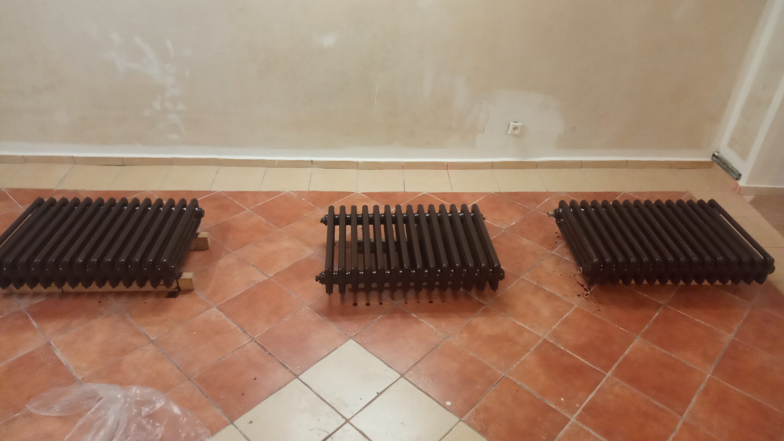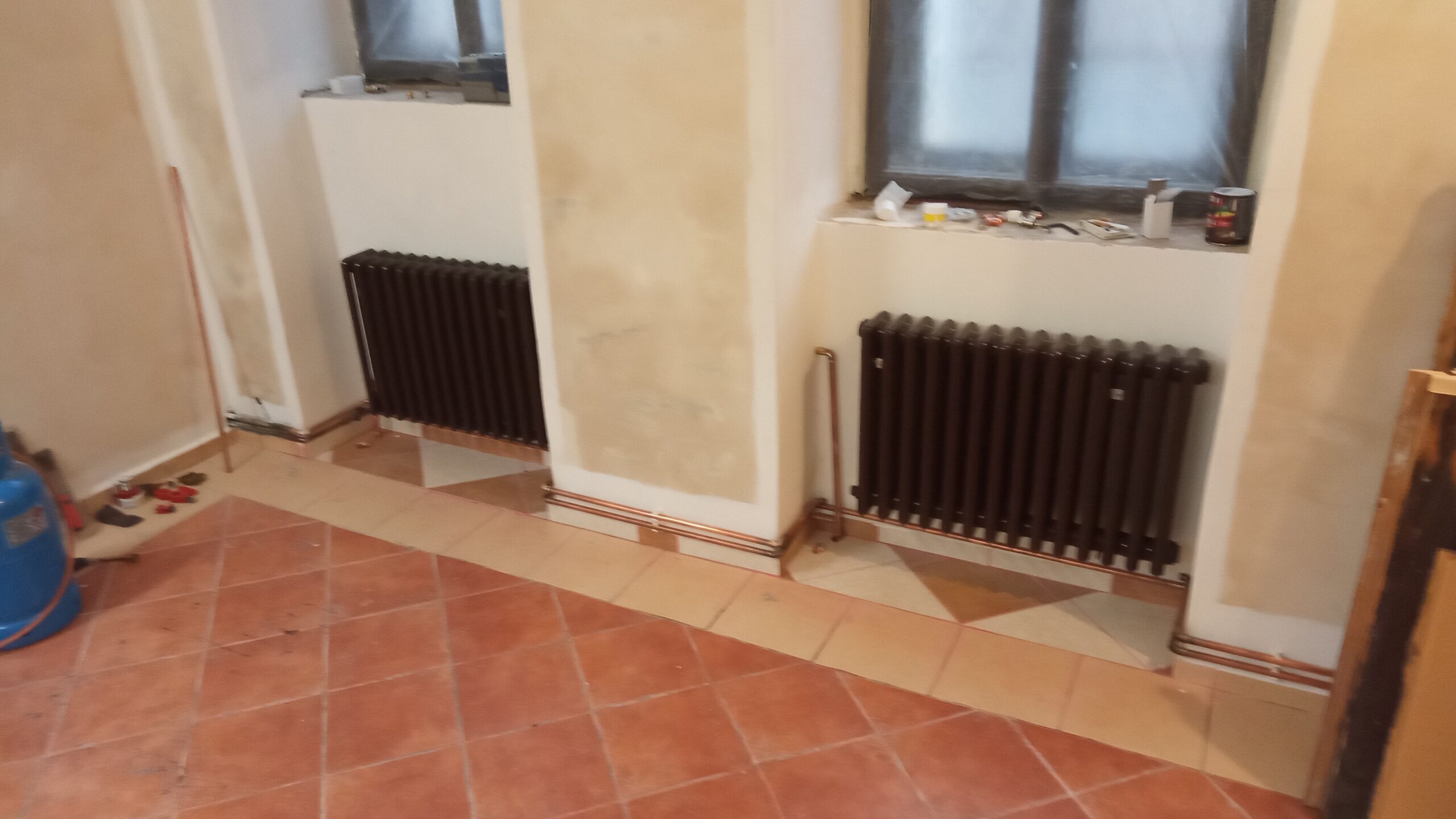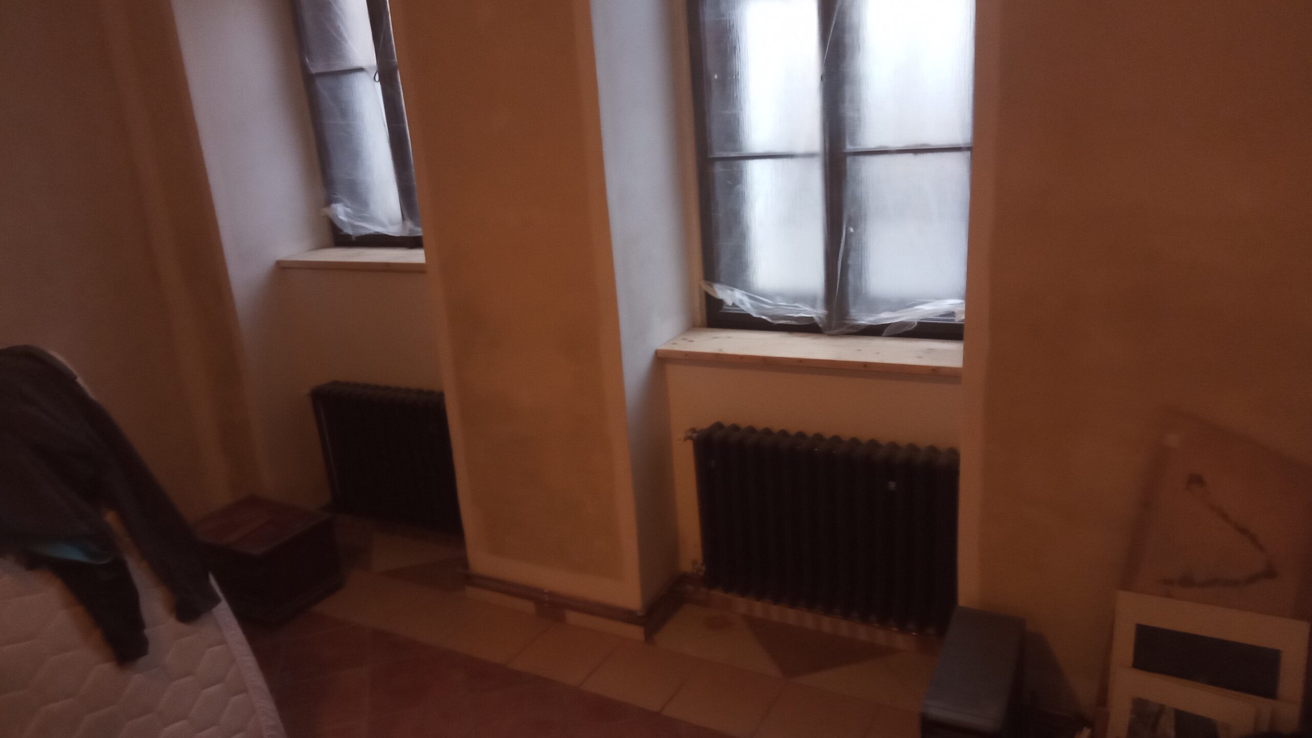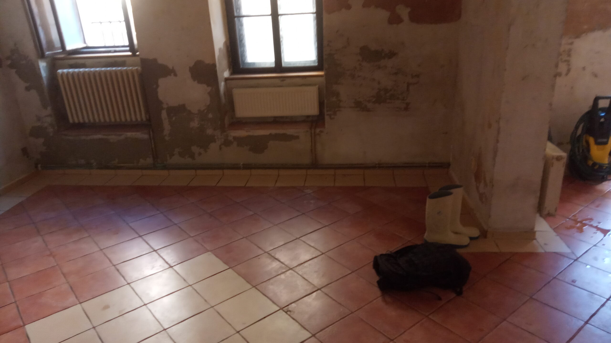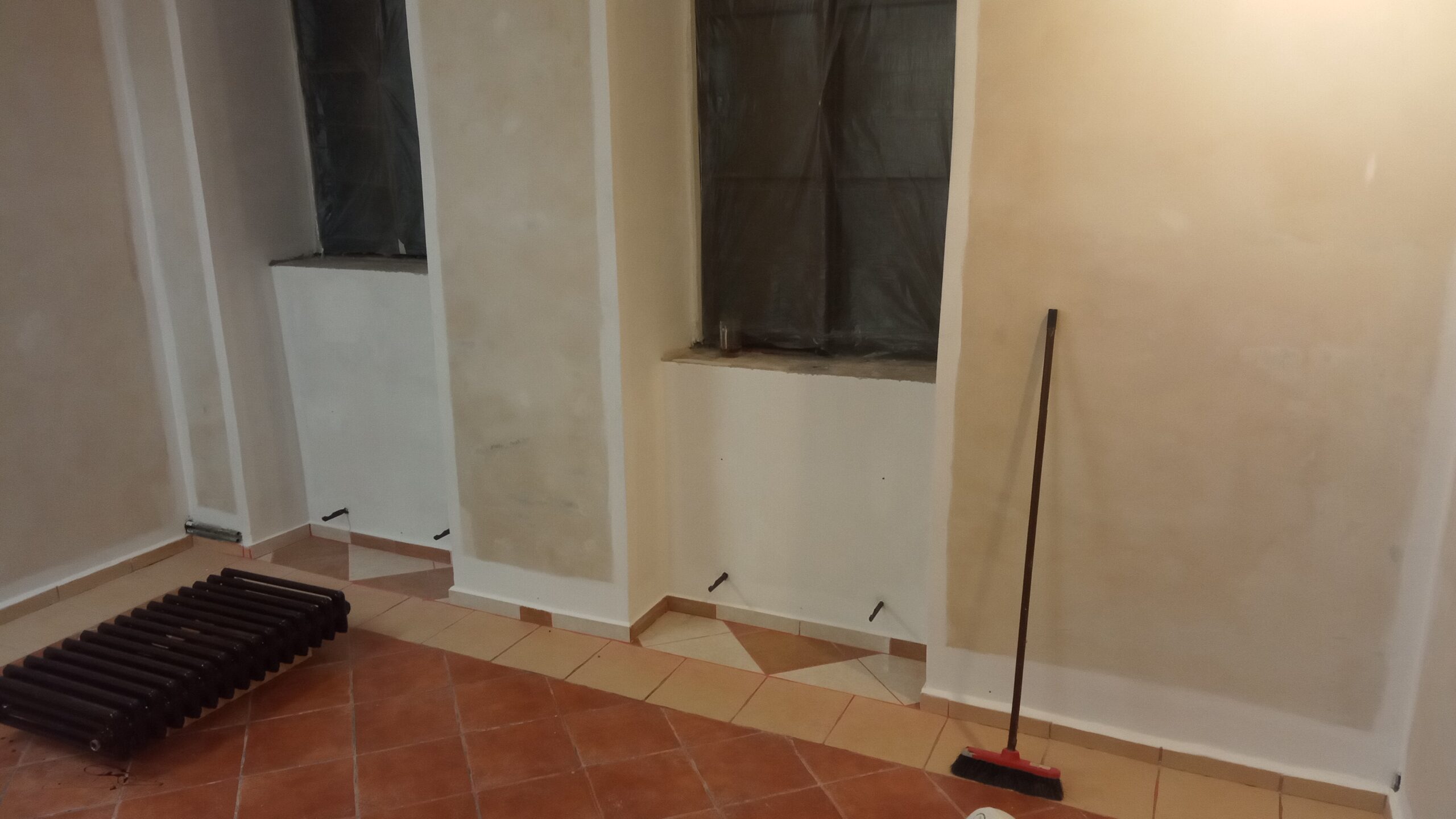 Vybourání špalet k zemi, omítky, štuk, repase těles, nový rozvod měď, výmalba.